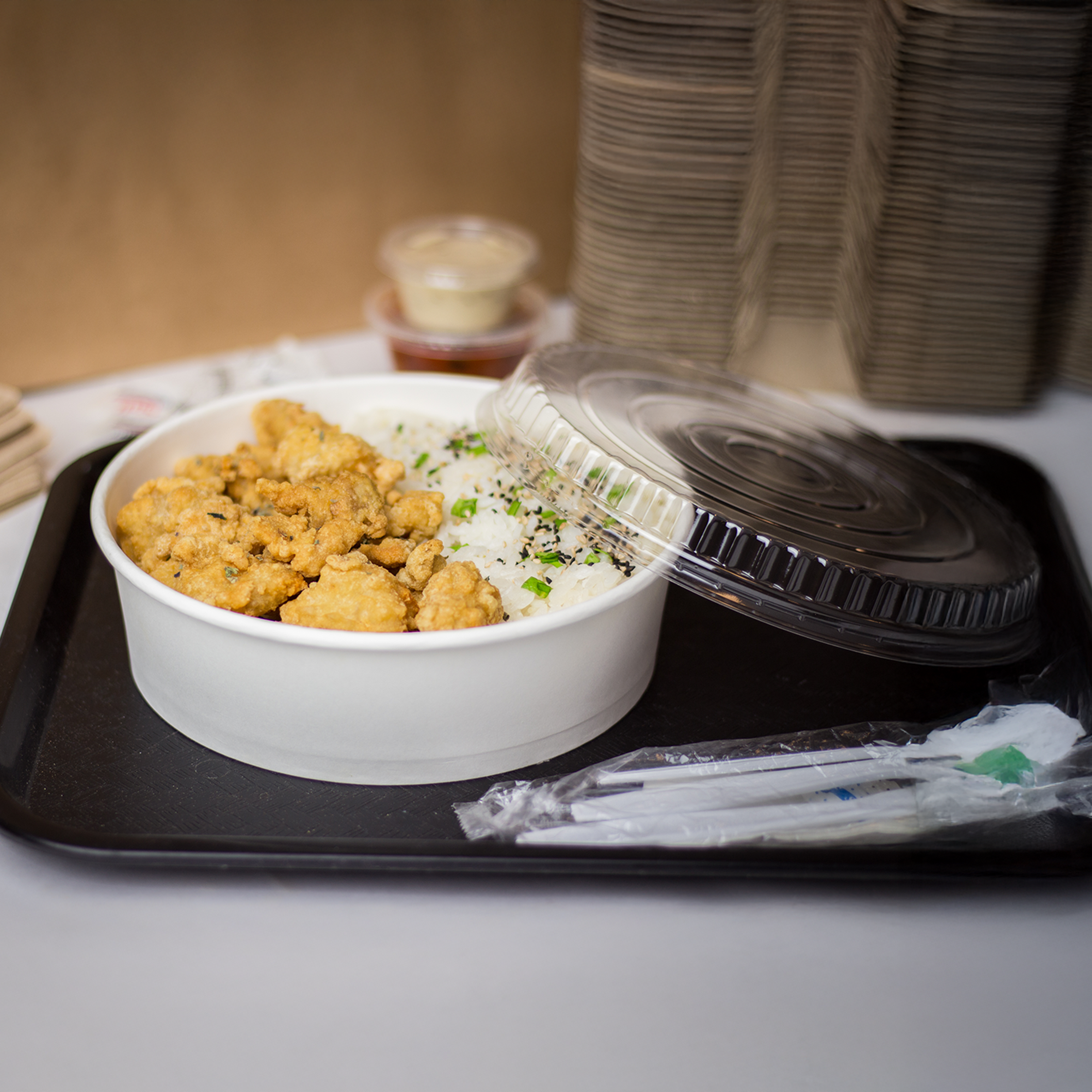 White Karat 32oz Paper Short Buckets with chicken and rice inside and lid on top