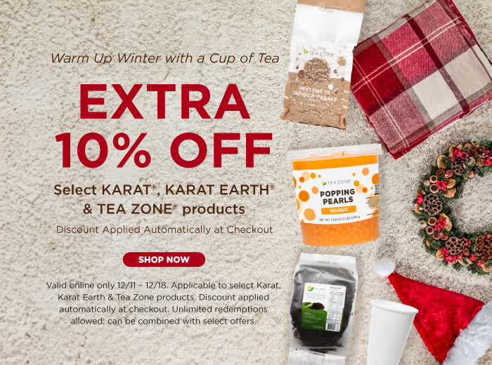 Disclaimer: Valid online only 12/11 - 12/18. Applicable to select Karat, Karat Earth, & Tea Zone products. Discount applied automatically at checkout. Unlimited redemptions allowed. Can be combined with select offers.