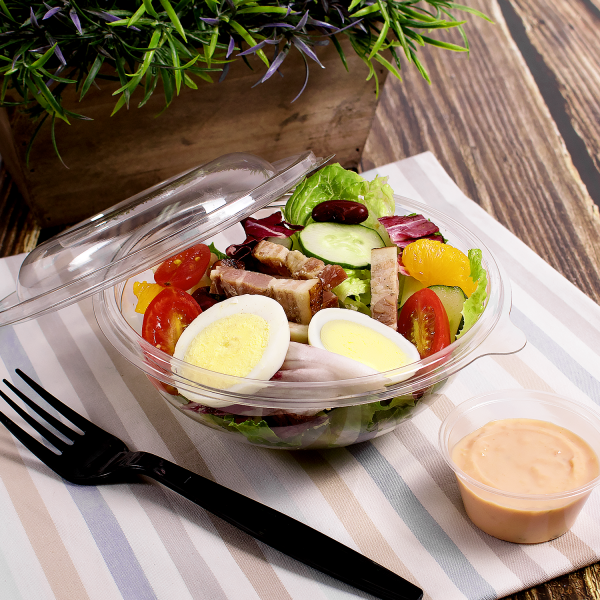 Karat® salad bowls provide a tasteful presentation option for cold food. PET plastic is high clarity for easy visibility of the contents inside. Bowls are freezer safe, stackable, and come with pull tabs for easy opening. *Matching PET Dome Lids sold separately.
