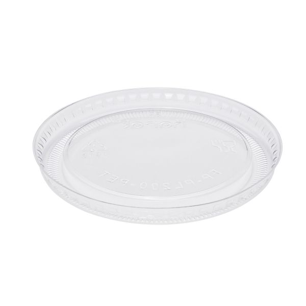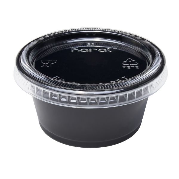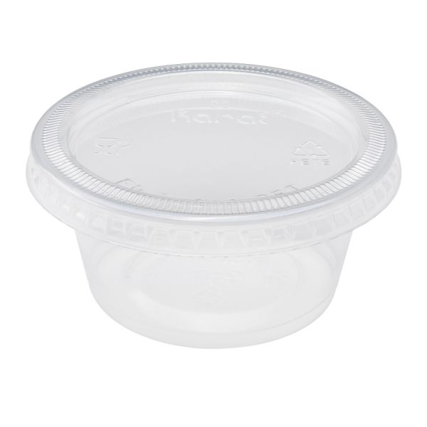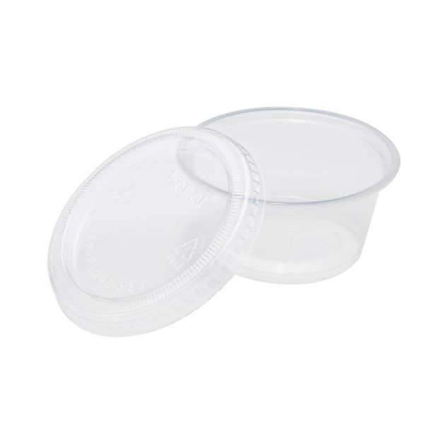 Get peace of mind when you top your 2 oz plastic portion cup with a Karat PET portion cup lid. These offer a secure seal on 1 oz, 1.5 oz, and 2 oz portion cups.