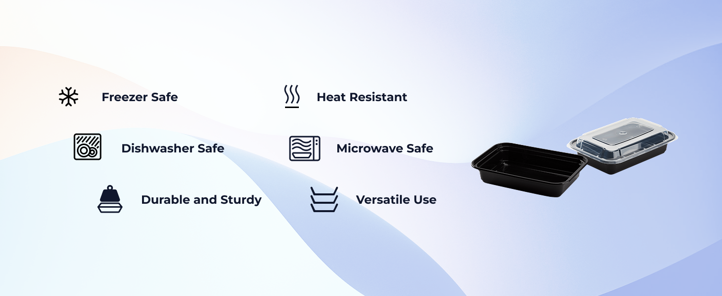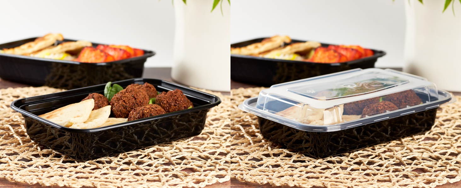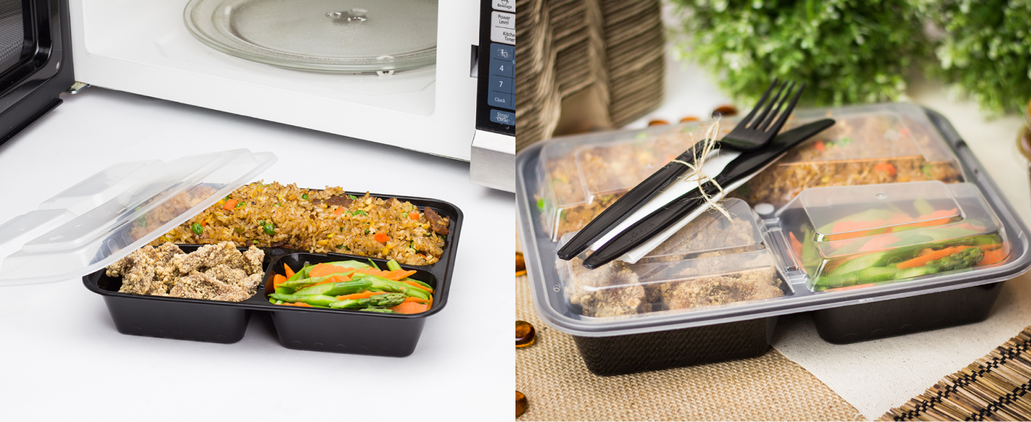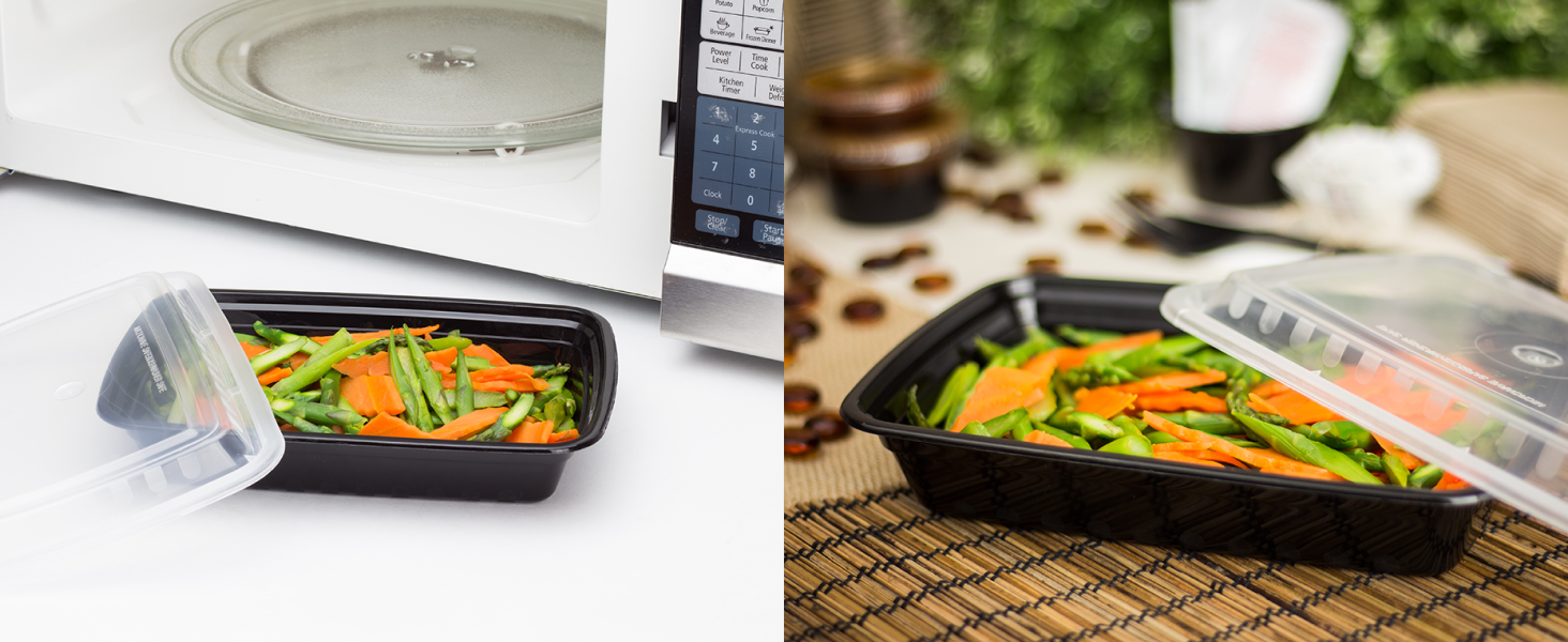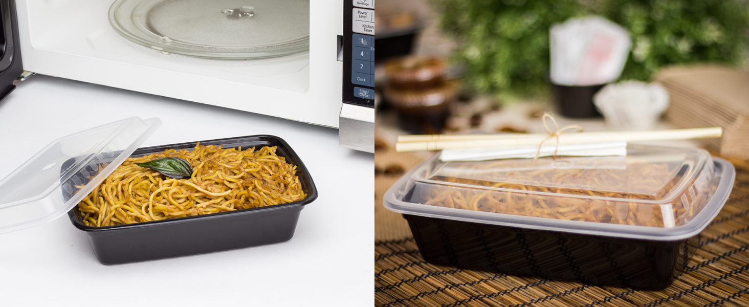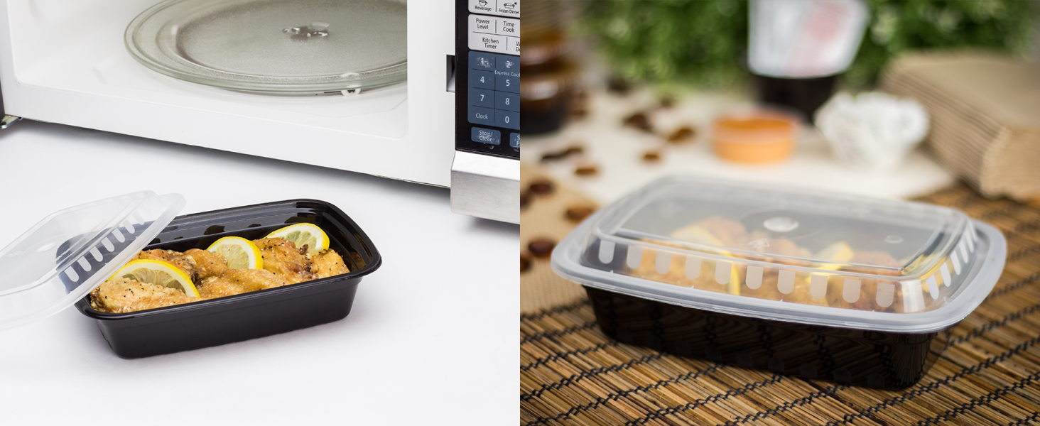 Karat round and rectangular black, PP injection molded containers and lids are great for takeout and leftovers. These containers are available in multiple sizes, and with multiple compartments. Containers are microwavable and dishwasher safe.