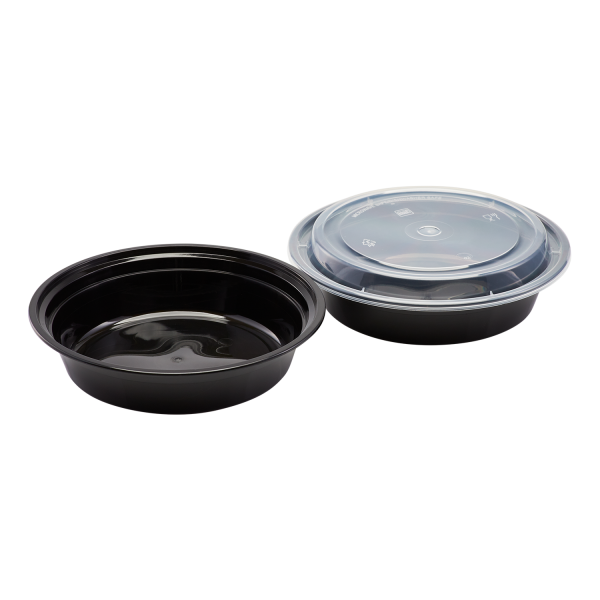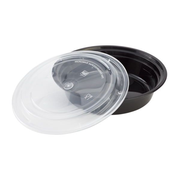 Karat round and rectangular black, PP injection molded containers and lids are great for takeout and leftovers. These containers are available in multiple sizes, and with multiple compartments. Containers are microwavable and dishwasher safe.