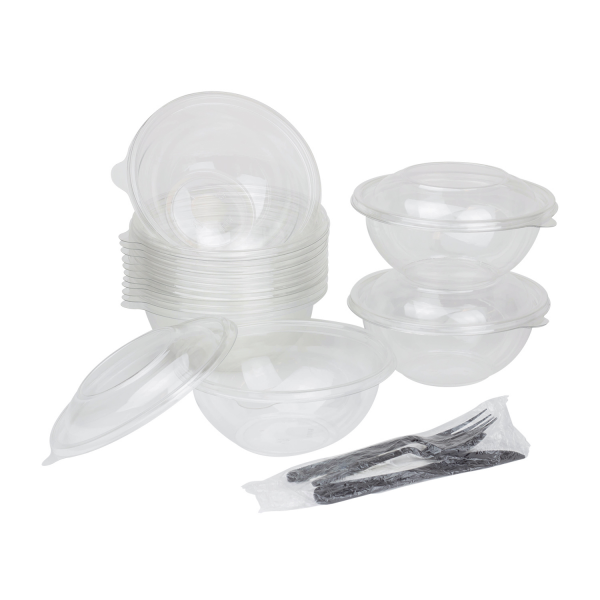 Karat® salad bowls lids provide a tasteful presentation option for cold food. PET plastic is high clarity for easy visibility of the contents inside. Bowls and lids are freezer safe, stackable, and come with pull tabs for easy opening.