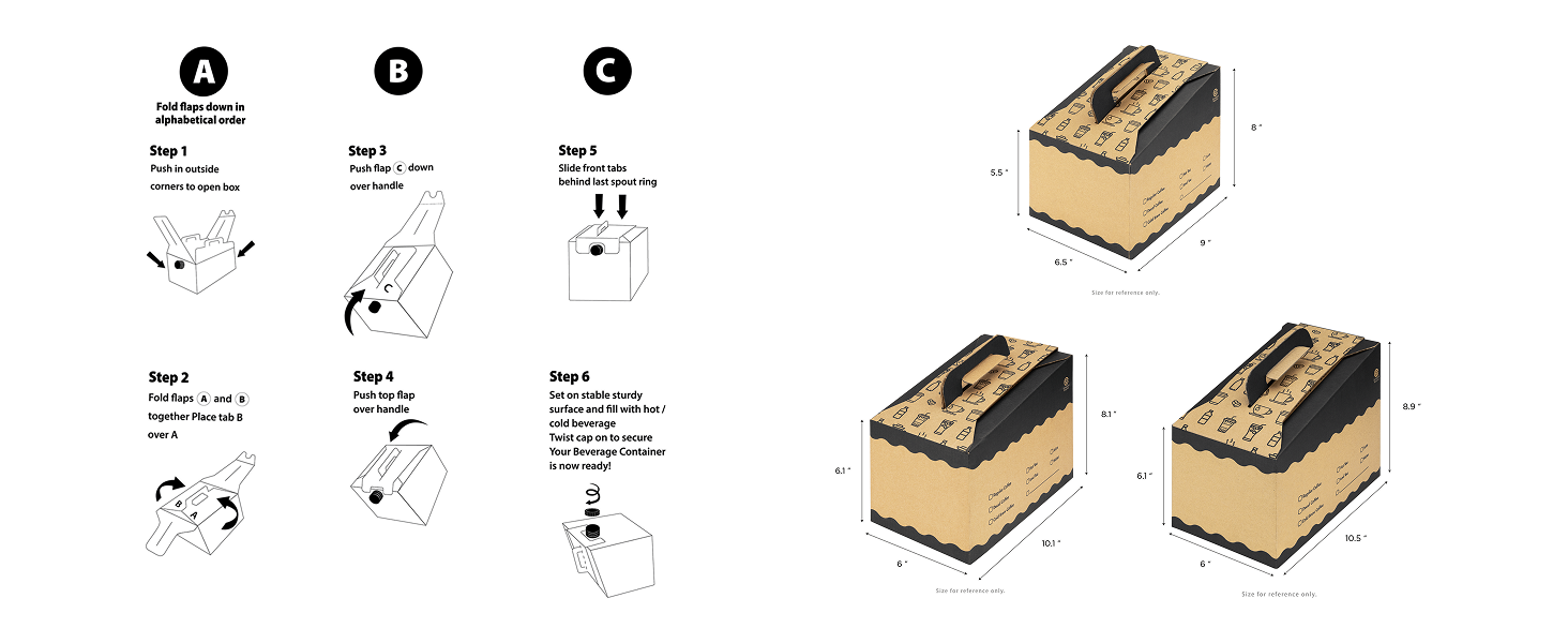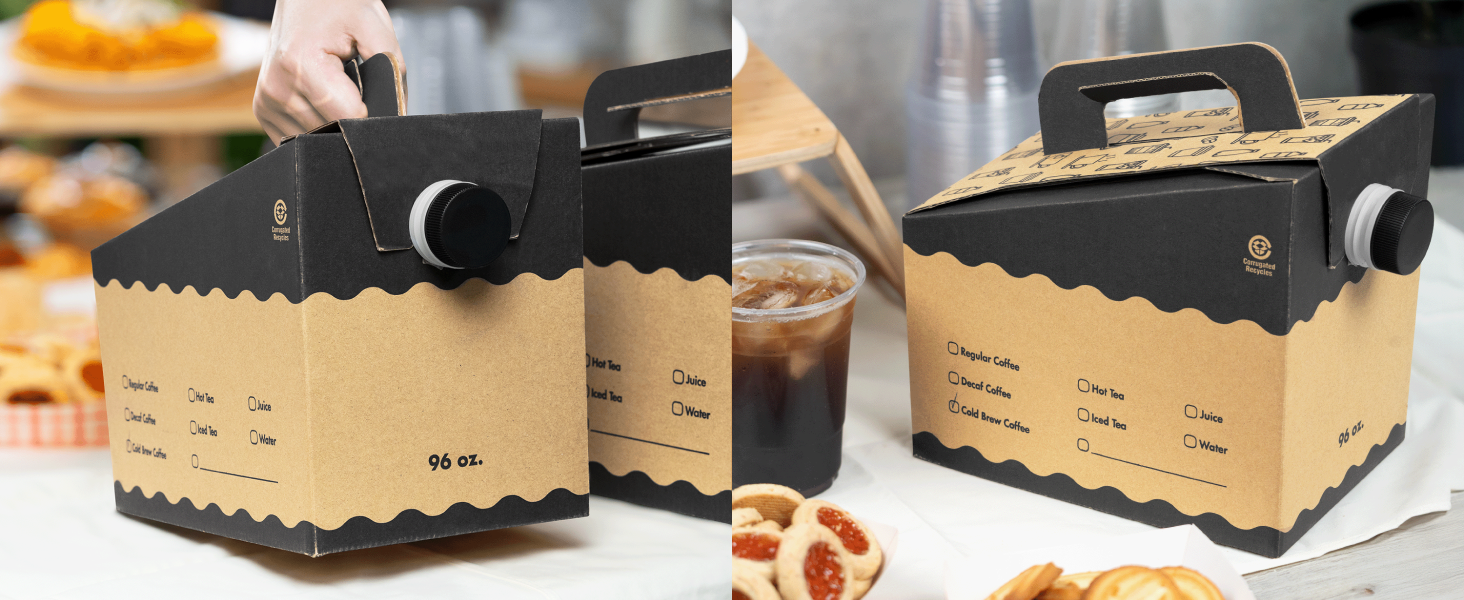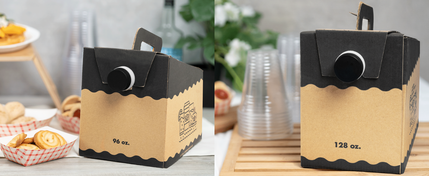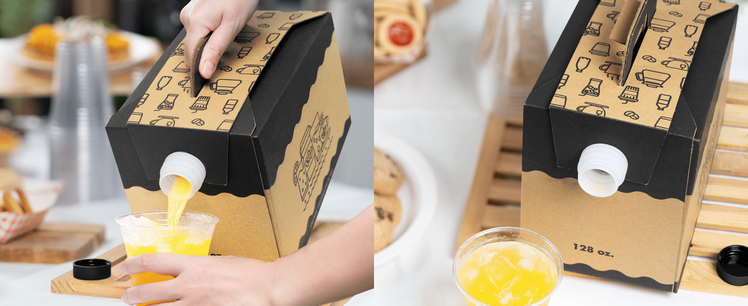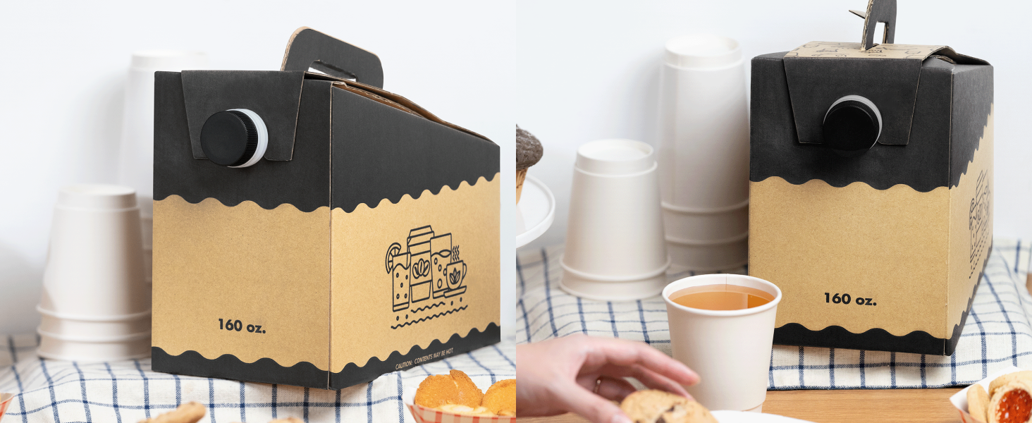 Each container is shipped flat-packed for efficient storage and features an intuitive folding design that allows for quick, tool-free assembly. Inside, a heat-compatible aluminum foil bag keeps beverages hot and fresh for hours, perfect for coffee, tea, hot chocolate, or cider. The easy-pour spout ensures smooth and spill-free dispensing every time.