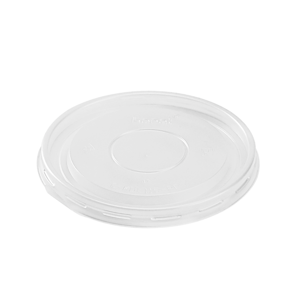 Karat high quality polypropylene (PP) flat lids are design to fit Karat double poly paper cold/hot food containers. Flat lids feature a venting hole for hot food items such as mashed potatoes and soups.