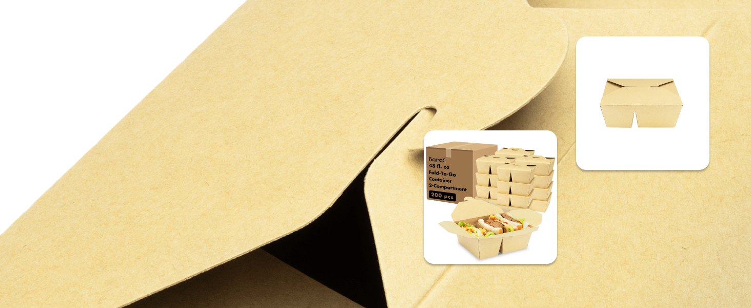Enhance your takeout and catering service with Karat Fold-To-Go Boxes, engineered for strength, versatility, and convenience. Crafted from heavy-duty paperboard with a PE lining, these containers deliver reliable resistance to cuts, leaks, and grease, while maintaining a clean and professional appearance.