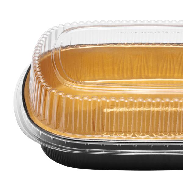 Karat 48 oz Black and Gold Aluminum Pans are the choice storage solution for food on the go. Pack leftovers or freshly-prepared hot meals for your customers to take home.