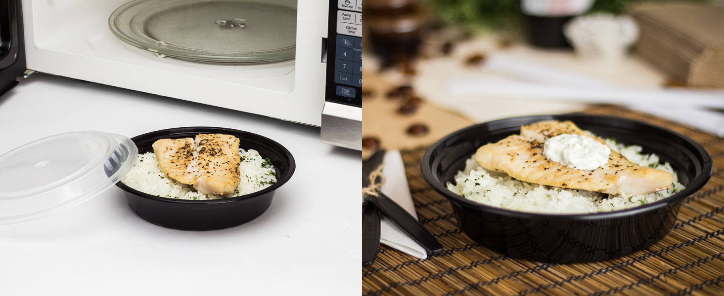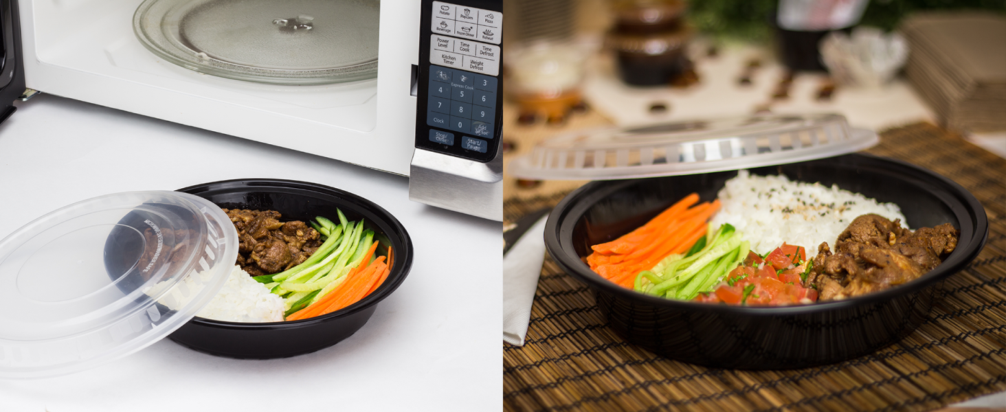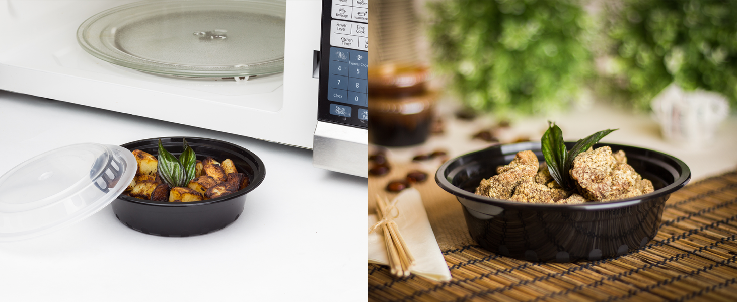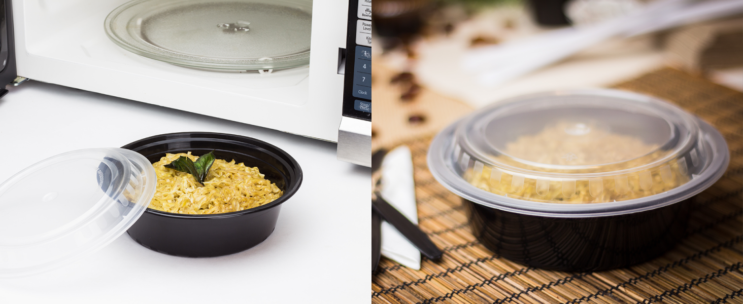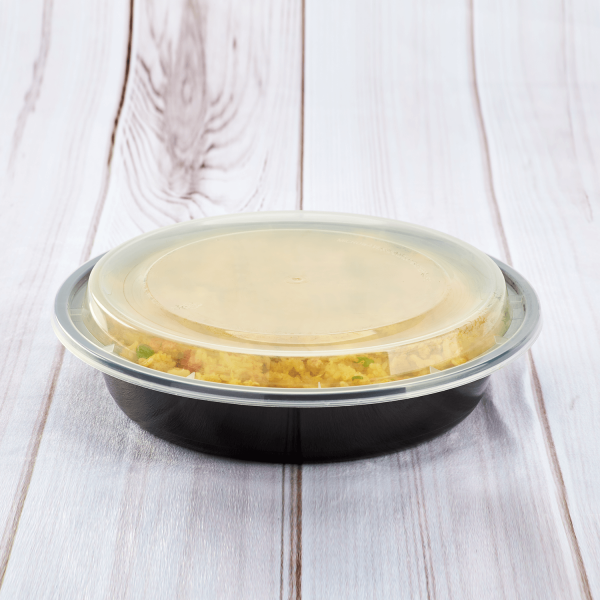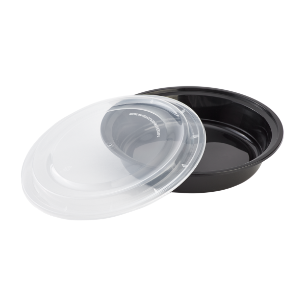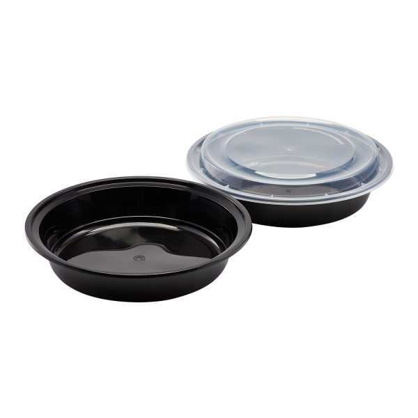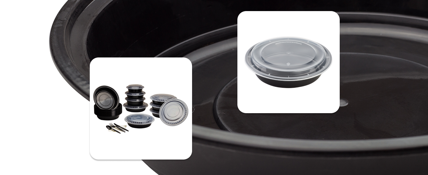 Karat round and rectangular black, PP injection molded containers and lids are great for takeout and leftovers. These containers are available in multiple sizes, and with multiple compartments. Containers are microwavable and dishwasher safe.