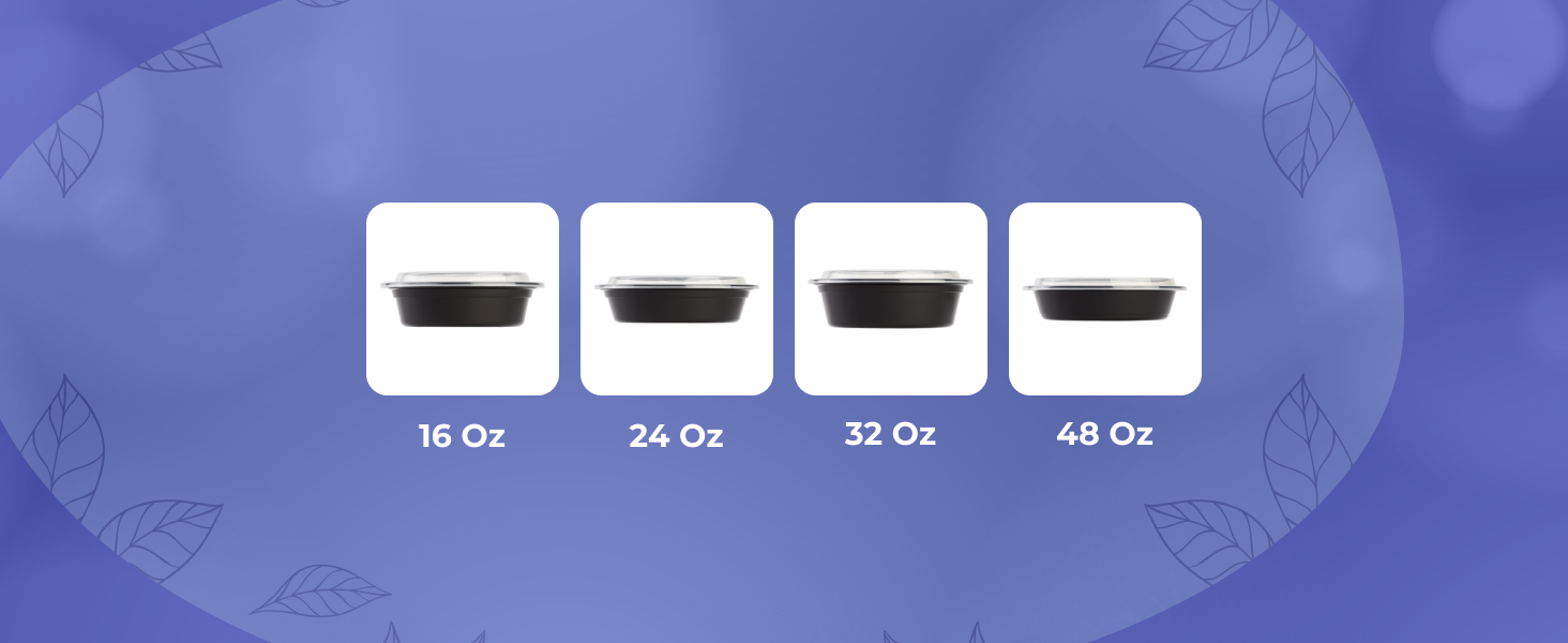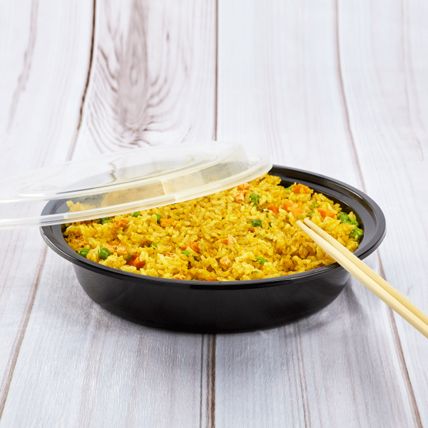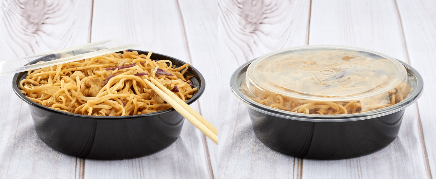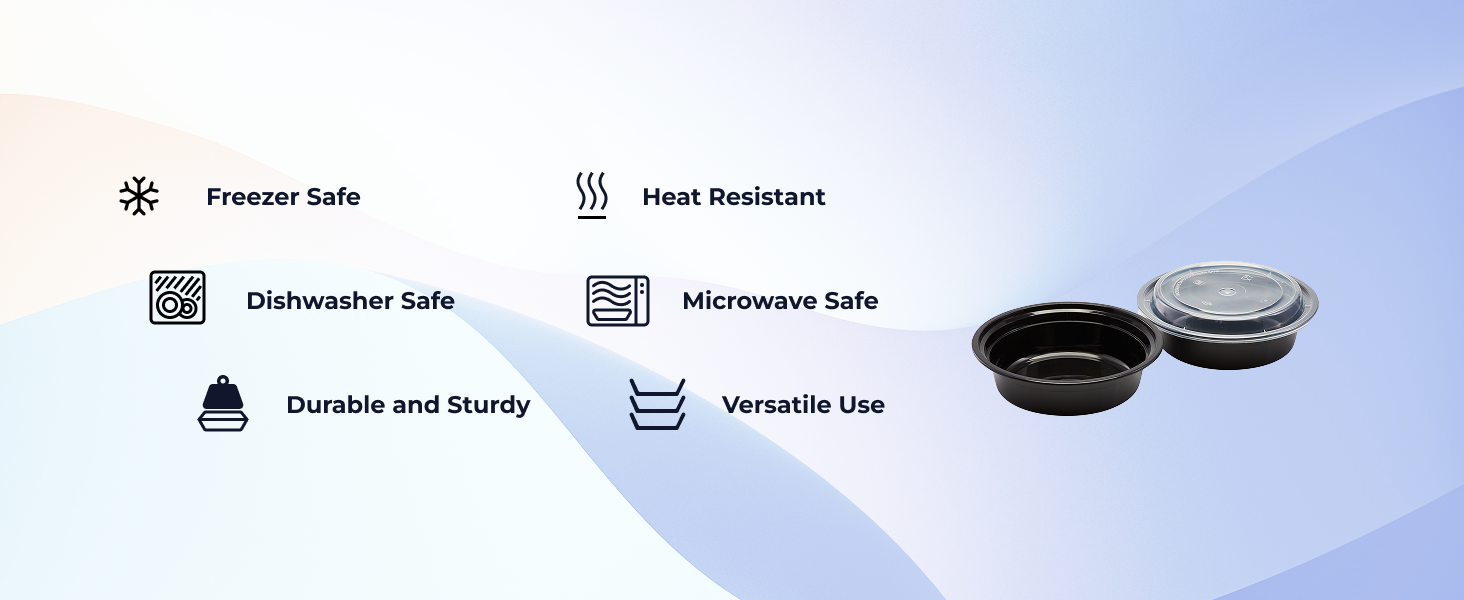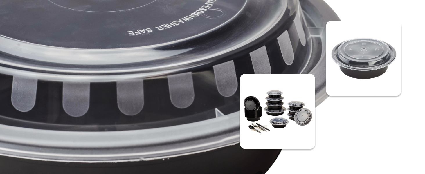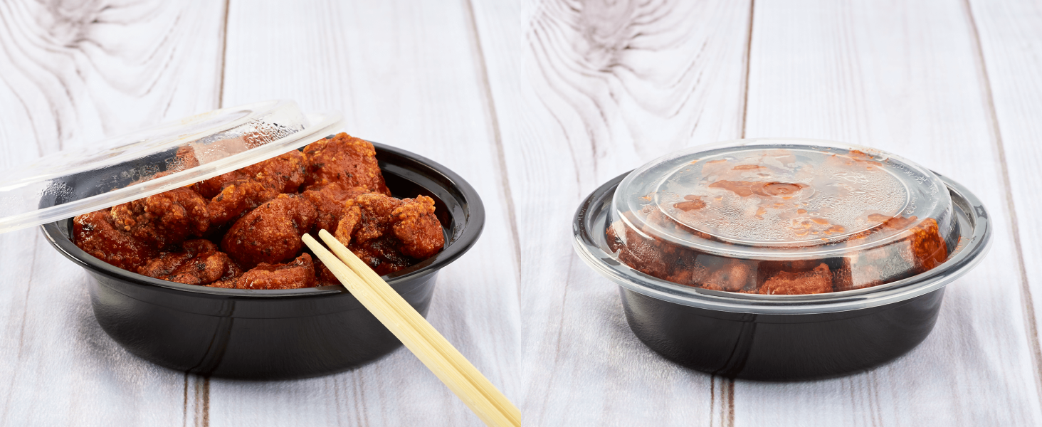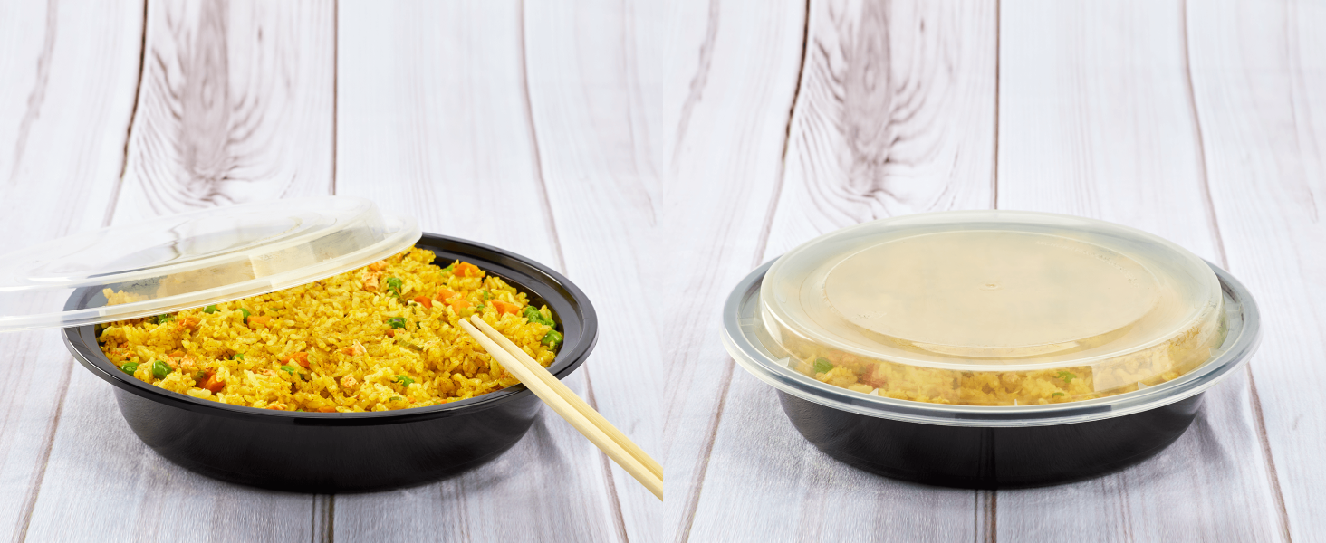 Karat round and rectangular black, PP injection molded containers and lids are great for takeout and leftovers. These containers are available in multiple sizes, and with multiple compartments. Containers are microwavable and dishwasher safe.