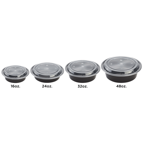 [150 sets] 48 oz PP Plastic Microwavable Round Food Containers & Lids (Black)
