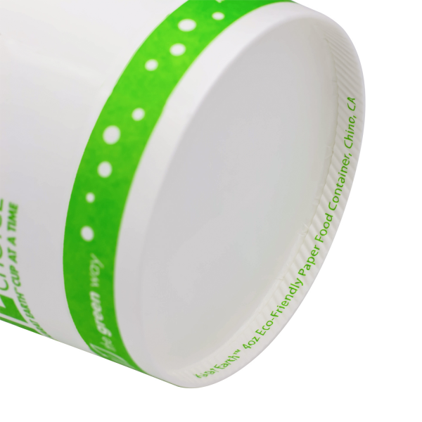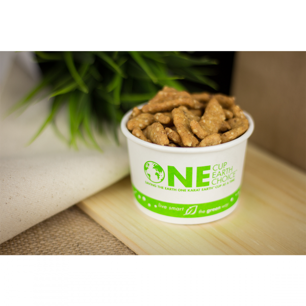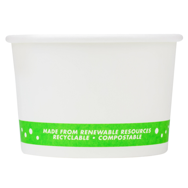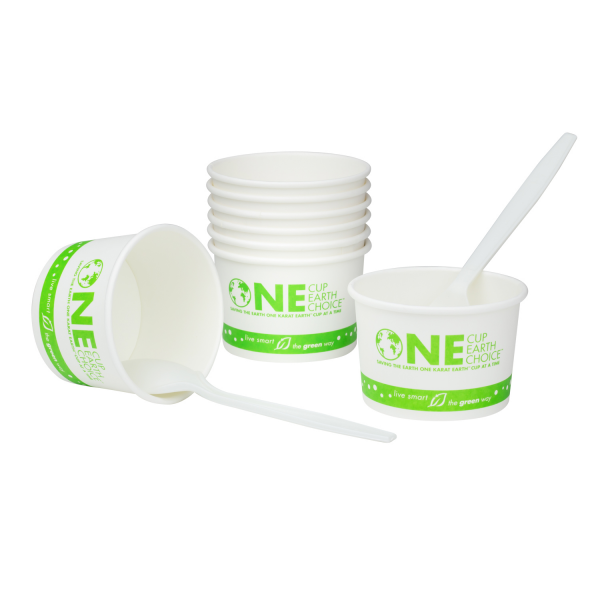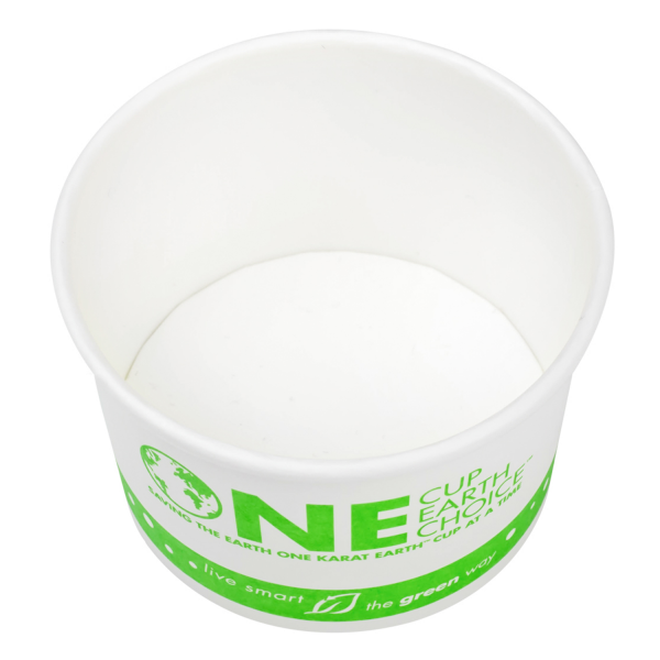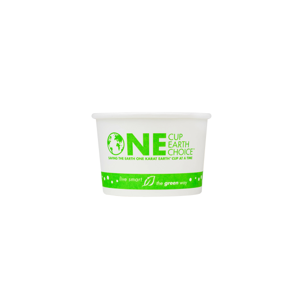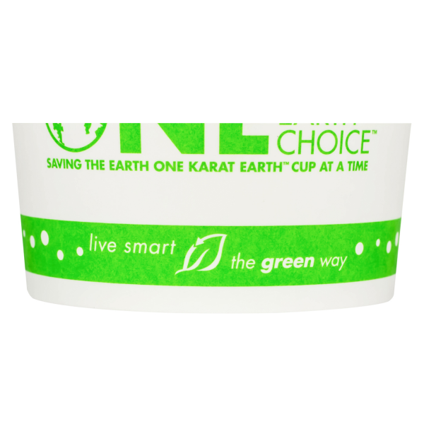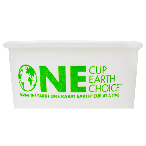 Karat Earth eco-friendly food containers are made from renewable resources and feature an interior PLA lining, which is made from the starch of corn, sugarcane, cassava, or beetroot plant. They are designed to be used with hot or cold foods from ice cream to side dishes, and come in multiple sizes to meet your foodservice needs. Choose white or the generic print with the slogan, “One Cup, One Earth, One Choice.”