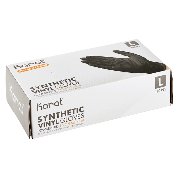 Karat Black Synthetic Vinyl Gloves are made from a blend of professional quality vinyl and nitrile materials which are comfortable for long wear yet tight and secure for your protection. Great for use in hospitals, restaurants, or home where disposable gloves are needed.