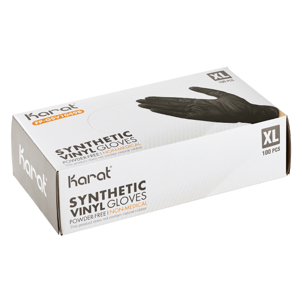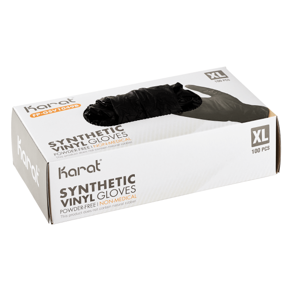Karat Black Synthetic Vinyl Gloves are made from a blend of professional quality vinyl and nitrile materials which are comfortable for long wear yet tight and secure for your protection. Great for use in hospitals, restaurants, or home where disposable gloves are needed.