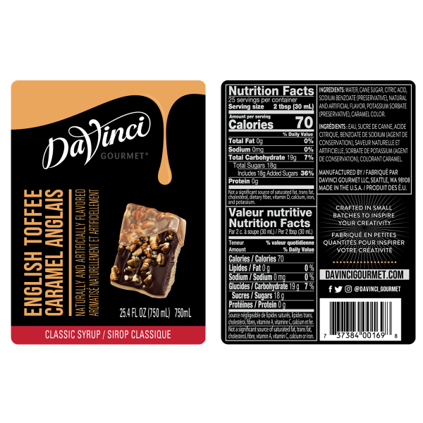 English Toffee Flavored Syrup from DaVinci Gourmet has a smooth, buttery flavor that is reminiscent of the classic candy. Made with pure cane sugar.