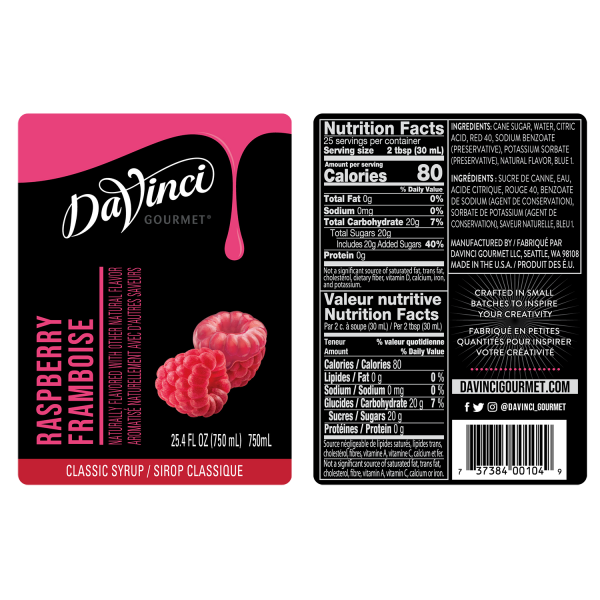 Raspberry Flavored Syrup by DaVinci Gourmet features the swweet, juicy flavor of fresh picked raspberries. Made with pure cane sugar.