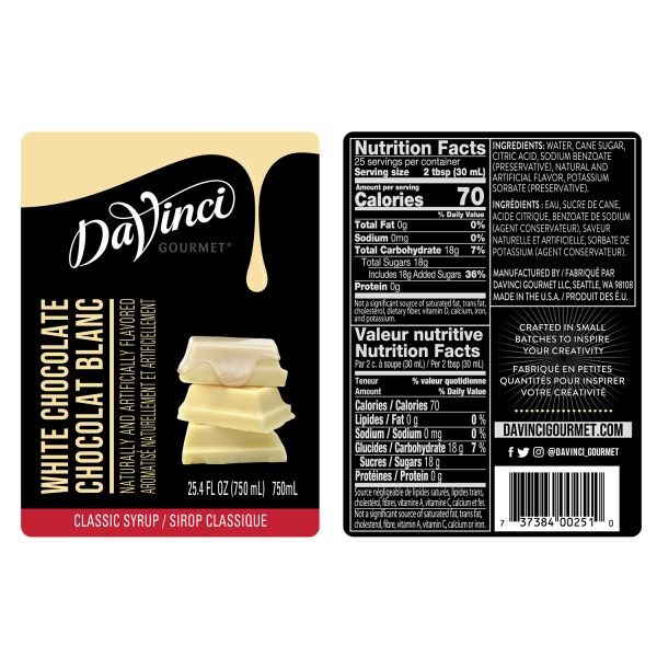 White Chocolate Flavored Syrup from DaVinci Gourmet contains the taste of vanilla beans that are lightly toasted and blended with cream and sugar. Made with pure cane sugar. This product is packaged in a 750 mL plastic bottle.