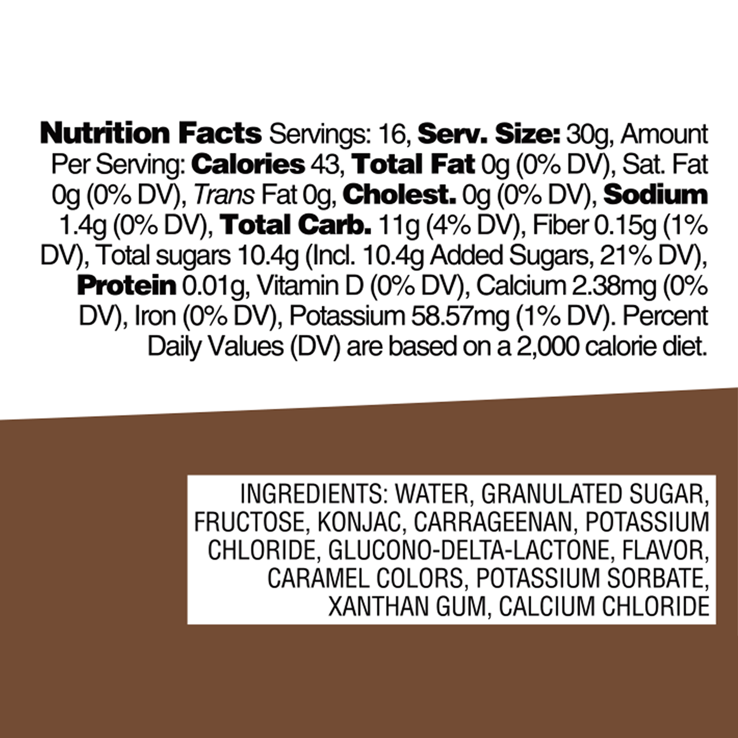 Ingredients: Water, Sugar, Coffee Powder, Calcium Lactate, Flavor, Carrageenan, Xanthan Gum, Caramel Color, Malic Acid, Potassium Sorbate, Sodium Citrate