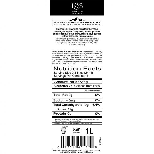 Enjoy a delicious buttery, vanilla madeleine in your favorite cocktail or hot beverage with 1883 Madeleine Syrup. This syrup is available in a 1 Liter glass bottle. Created and produced in the brand's all-natural birthplace in the French Alps, 1883 syrups are recognized for their authenticity, purity, and aromatic intensity.