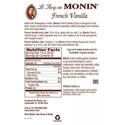 Monin French Vanilla Syrup offers a fragrant, bold vanilla flavor derived from select Madagascar vanilla beans; created especially for iced or frozen lattes and coffees. Made with select ingredients and pure cane sugar, Monin French Vanilla Syrup is a highly concentrated, authentic flavoring offering exceptional versatility for creating specialty beverages.
