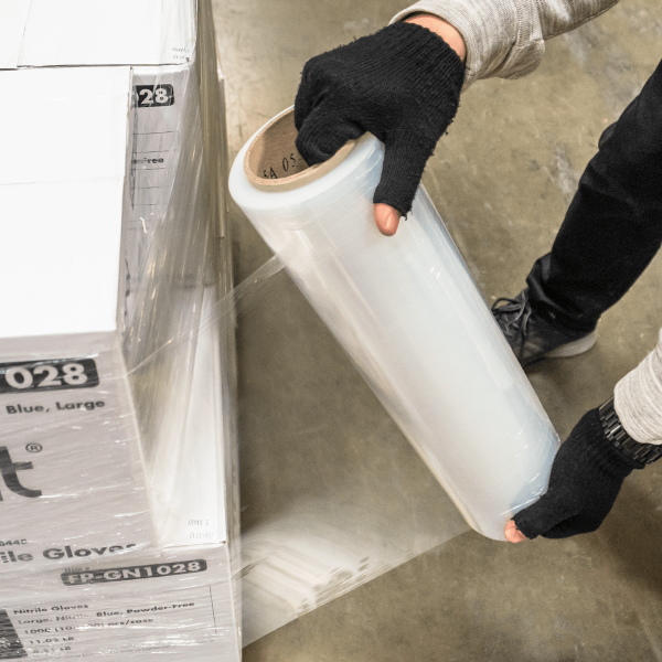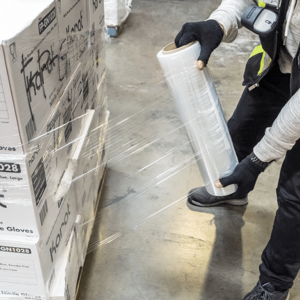 Karat Hand Wrap Stretch Film allows workers to tightly wrap boxes and stacked pallets.