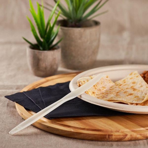 Karat Earth Bio-based Utensils are ideal for restaurants, cafe or home uses. Each knife comes individually wrapped for sanitary handling. Designed to be eco-friendly, these knives are made from renewable and sustainable resources, offering a biodegradable and compostable solution. Plus, they offer superior strength and durability -- perfect for everyday use.