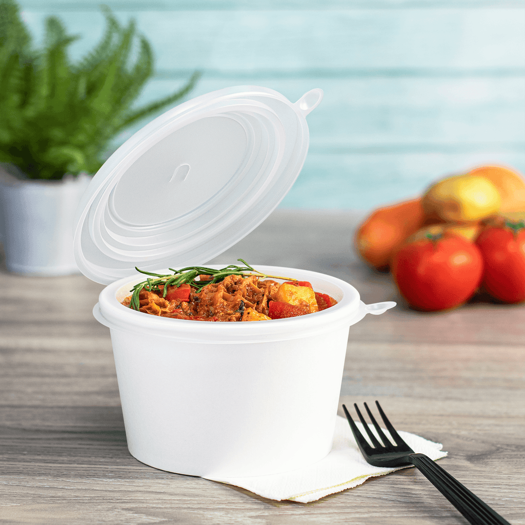 Karat 16 oz PP Hinged Insert for 24-32 oz Paper Food Containers are perfect for hot foods such as stews and soups. They are transparent and have a lid attached for all to-go packaging needs. These inserts are also compatible with 24-32 oz Paper Food Containers for extra security.