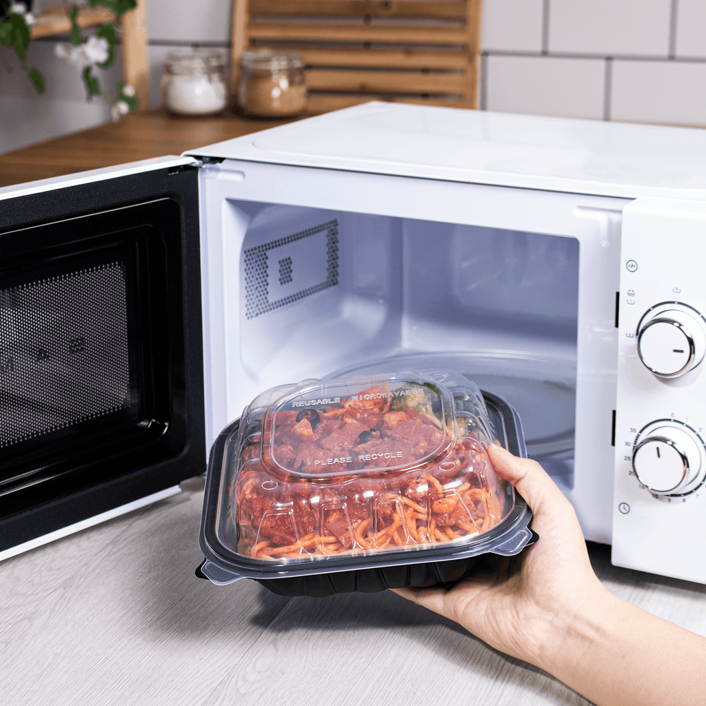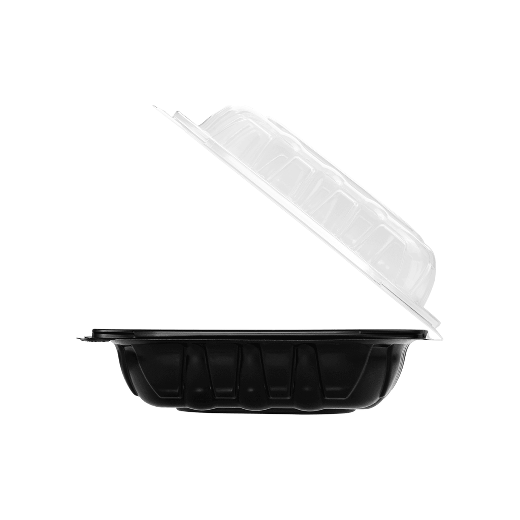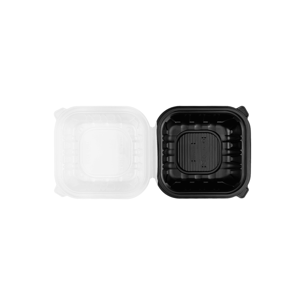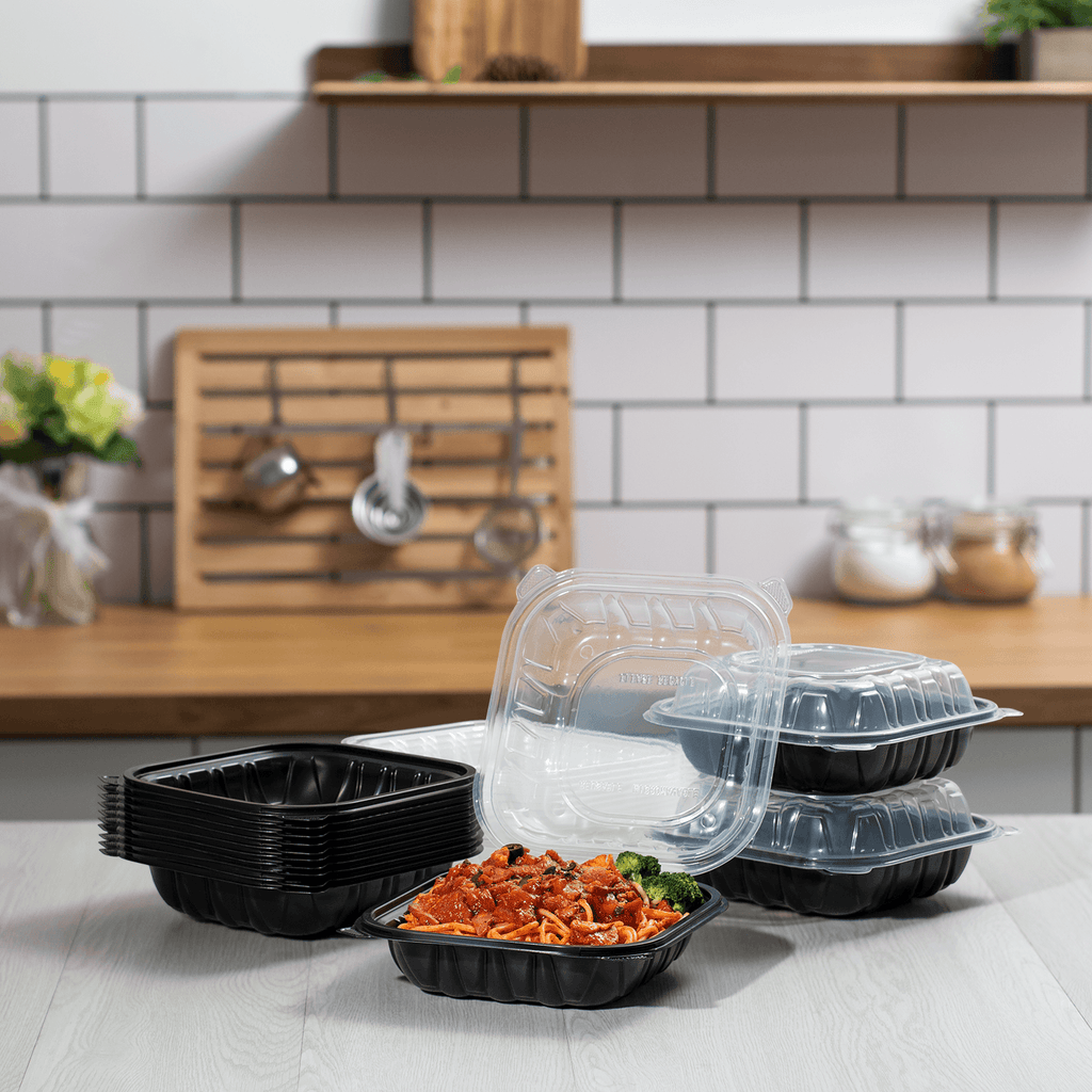 Karat® offers three types of hinged food containers, made of PET, PP, and Premium PP, designed for the safe and convenient transport of hot and cold foods. The Premium PP hinged containers are also ideal for hot, fresh food and microwaving, featuring four vents. These containers are sturdy and versatile, making them suitable for all types of food packaging.