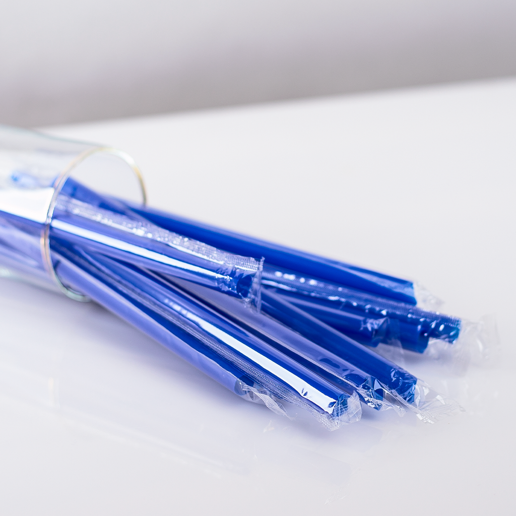 Karat 9" Colossal, Blue, Poly Wrapped Straws are high quality and perfect for drinks that contain add-ons such as boba, popping pearls, jellies, and fruit bits. Each straw is individually poly-wrapped and diagonally cut at one end to puncture any type of sealing film.