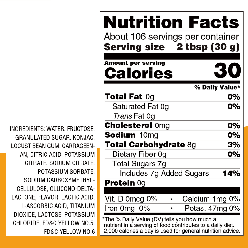Water, Fructose, Granulated Sugar, Konjac, Locust Bean Gum, Carrageenan, Citric Acid, Potassium Citrates, Sodium Citrate, Potassium Sorbate, Sodium Carboxymethlcellulose, Gluconolactone, Flavor, Lacotic Acid, L-Ascorbic Acid, Titanium Chloride, Latcose, Potassium Choloride