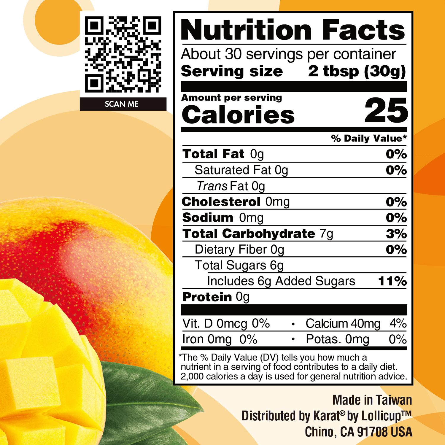 Ingredients: Water, Fructose, Starch Acetate, Calcium Lactate, Citric Acid, Sodium Alginate, Xanthan Gum, Mango Flavor, Calcium Chloride, Potassium Sorbate, Sodium Erythorbate, Sucralose, Fd&C Yellow No. 6, CMC