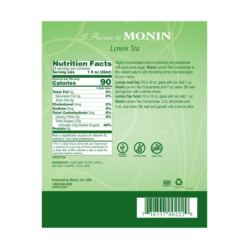 Iced tea is said to be first served at the 1904 St. Louis World Fair by a tea plantation owner seeking to serve a refreshing beverage on a hot summer day. From that day, tea consumption has grown exponentially. Highly concentrated and conveniently pre-sweetened with pure cane sugar, Monin Lemon Tea Concentrate is the easiest way to add delicious lemon flavored tea beverages to your menu.