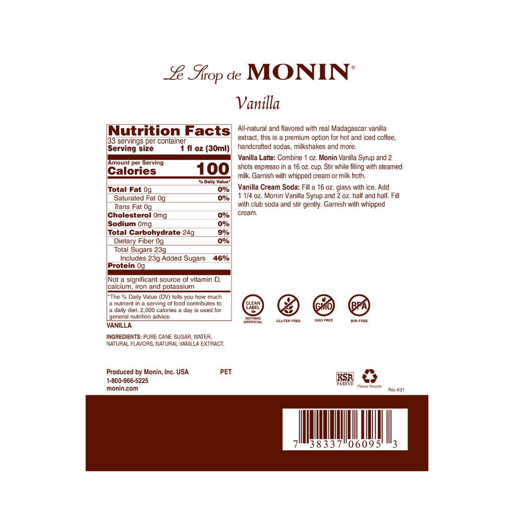 Experience the rich and authentic flavor of pure Madagascar vanilla with Monin Vanilla Syrup. Our syrup is made with only the finest vanilla beans to ensure that every sip is packed with high-quality, rich flavor. Perfect for adding a smooth warmth to any beverage, Monin Vanilla Syrup is a popular and versatile flavor that can be used in lattes, mochas, smoothies, shakes, specialty cocktails, and even whipped cream. Elevate the taste of your favorite drinks and desserts with Monin Vanilla Syrup.