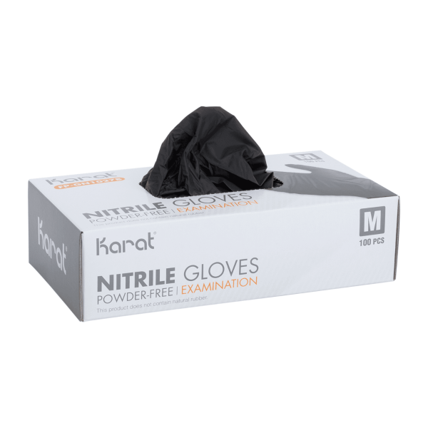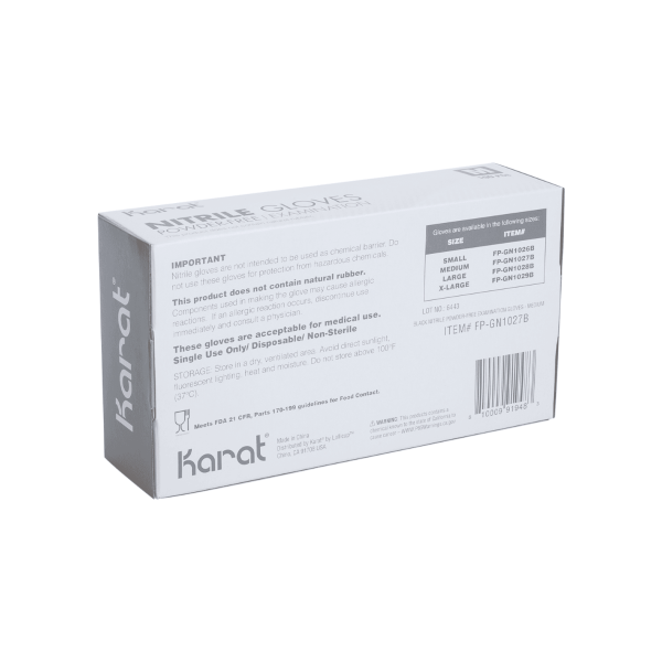 Karat Nitrile Gloves contain no latex and are powder-free. Having the highest level of touch sensitivity due to the glove's ability to mold to your hand for a good fit, our nitrile gloves are good to wear for an extended amount of time. Of the four material types of gloves we offer, our nitrile gloves are the most puncture resistant and are colored black to help identify if the glove has been punctured. These gloves are intended for food preparation purposes.