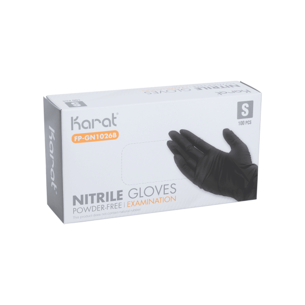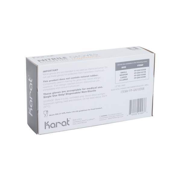 Karat Nitrile Gloves contain no latex and are powder-free. Having the highest level of touch sensitivity due to the glove's ability to mold to your hand for a good fit, our nitrile gloves are good to wear for an extended amount of time. Of the four material types of gloves we offer, our nitrile gloves are the most puncture resistant and are colored black to help identify if the glove has been punctured. These gloves are intended for food preparation purposes.
