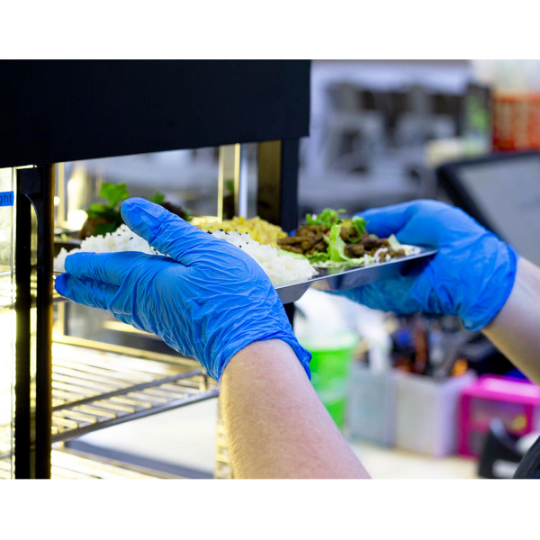 Karat Nitrile Gloves contain no latex and are powder-free. Having the highest level of touch sensitivity due to the glove's ability to mold to your hand for a good fit, our nitrile gloves are good to wear for an extended amount of time. Of the four material types of gloves we offer, our nitrile gloves are the most puncture resistant and are colored blue to help identify if the glove has been punctured. These gloves are intended for food preparation purposes.