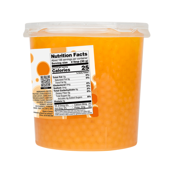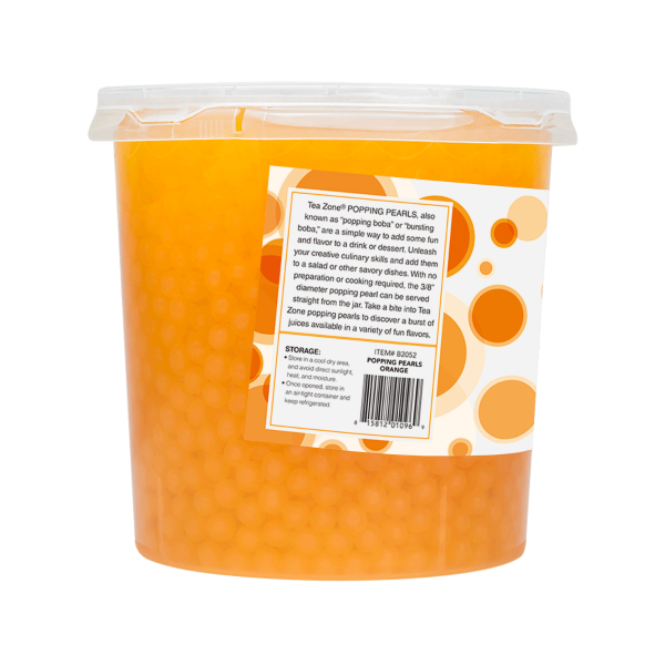 A little smaller in size than the regular tapioca boba, Tea Zone Orange Popping Pearls gives a satisfying burst of fruit flavor when bitten. The bright orange color of boba jelly balls makes your drink recipes look even more delicious. The bursting boba is rich in fruit extracts and their gummy texture makes them a unique add-on to any cold beverage.