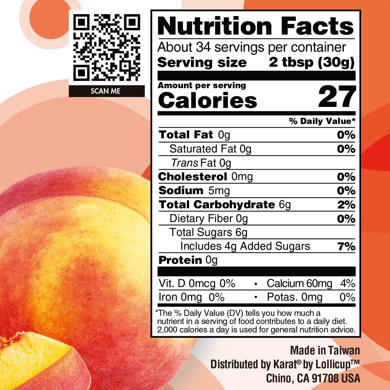 Ingredients: Water, Fructose, Peach Flavored Syrup, Starch, Calcium Lactate, Seaweed Extract, Flavor, Malic Acid, Potassium Sorbate