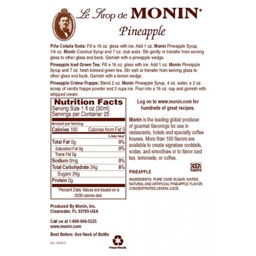 Much appreciated for its delicious flavor, pineapple is a great way to add a tropical touch to any beverage. Made with select ingredients and pure cane sugar, Monin Pineapple Syrup is a highly concentrated, authentic flavoring offering exceptional versatility for creating specialty beverages.