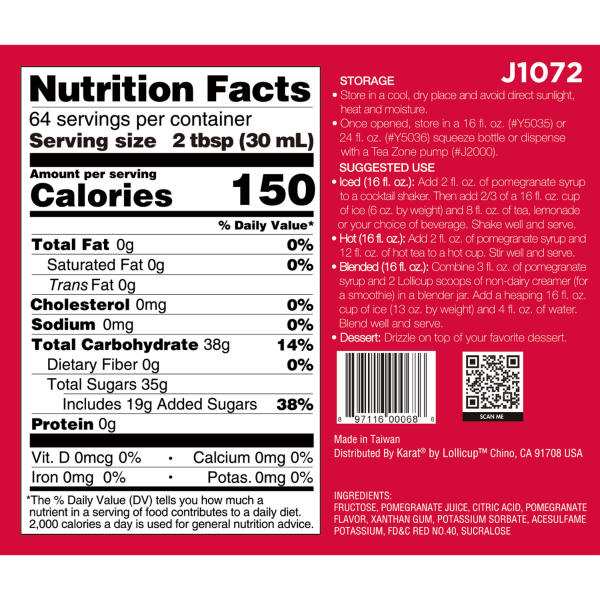 Bring your beverages, frozen yogurt, and snow cones alive with Tea Zone Pomegranate Syrup. It will add a sweet, tart fruit flavor to anything! Add it with additional flavors to make your taste buds dance. It is perfect for making slushies, smoothies, juices, flavored teas, frozen yogurt, shaved ice, and even alcoholic cocktails.