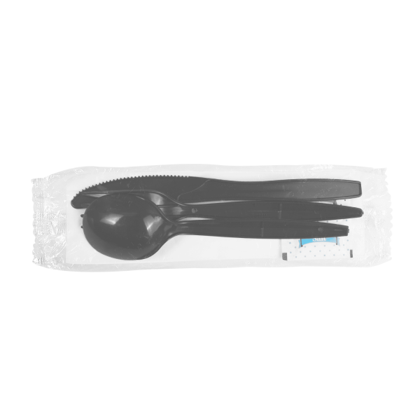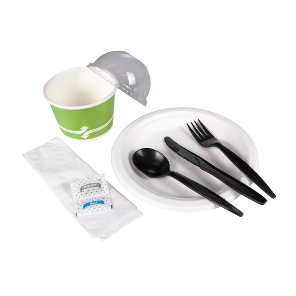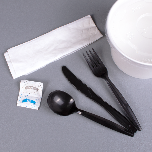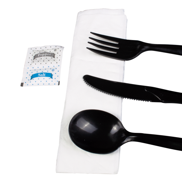 - Contains: 1 Fork, 1 Soup Spoon, 1 Knife, 1 Single Ply Napkin, 1 Salt Packet, and 1 Pepper Packet