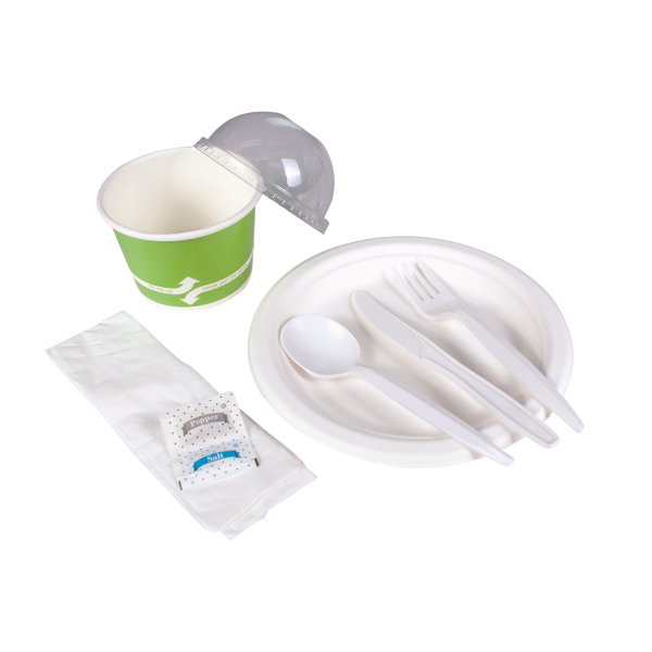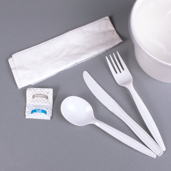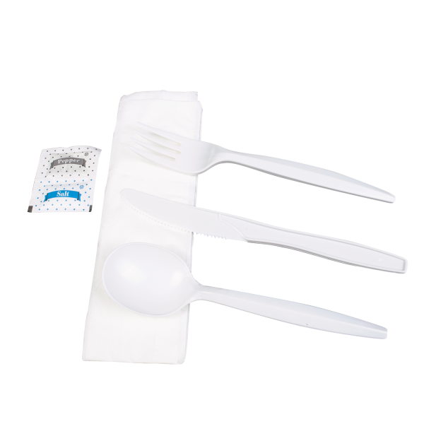 - Contains: 1 Fork, 1 Soup Spoon, 1 Knife, 1 Single Ply Napkin, 1 Salt Packet, and 1 Pepper Packet