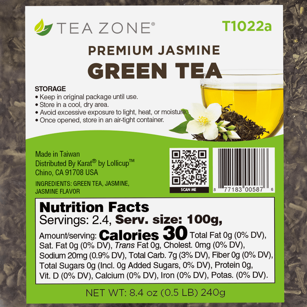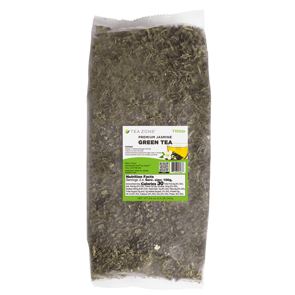 Jasmine is a flowering plant in tropical regions, including eastern South Asia via India. Jasmine Green Tea is scented with the aroma of jasmine blossoms. Green tea leaves are harvested in spring and stored until summer when Jasmine flowers are in bloom. The flowers are picked at dawn when the petals are closed. Until nightfalls, they open and release the fragrance. The green tea leaves are blended jasmine flowers and stored overnight to absorb the fragrance and flavour of the jasmine blossoms. Tea zone Premium Jasmine Green Tea Leaves have smooth and mild taste which are perfect for boba milk tea.