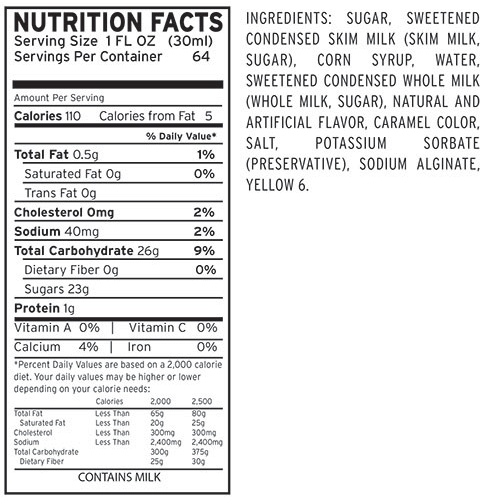 Ingredients: Sugar, Water, Corn Syrup, Nonfat Dry Milk, Heavy Cream, Pumpkin Puree, Natural and Artificial Flavor, Caramel Color, Salt, Potassium Sorbate (preservative), Sodium Alginate, Yellow 6. CONTAINS SULFITING AGENTS. *Contains Milk.