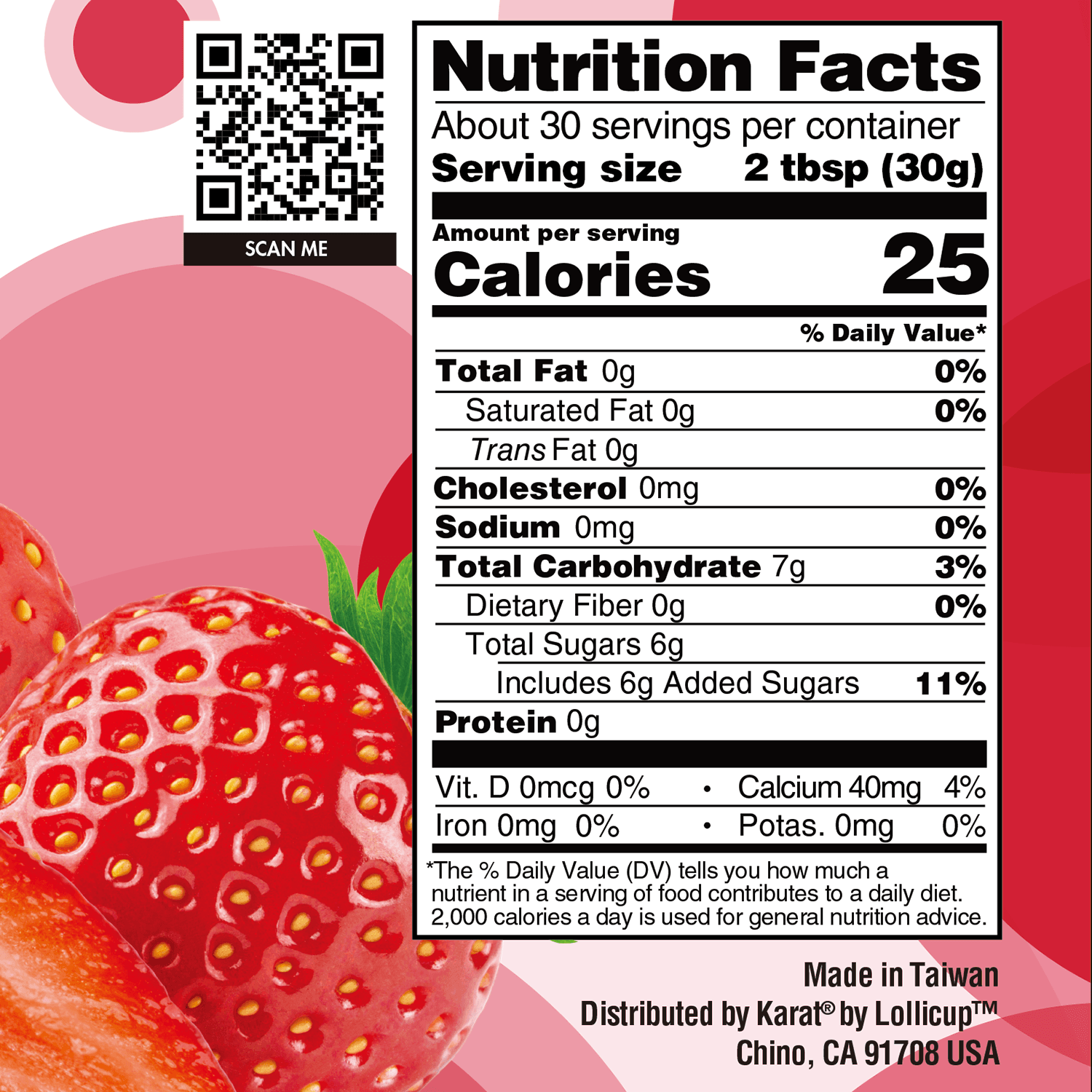 Ingredients: Water, Fructose, Starch Acetate, Calcium Lactate, Citric Acid, Sodium Alginate, Xanthan Gum, Strawberry Flavor, Calcium Chloride, Potassium Sorbate, Sodium Erythorbate, Sucralose, FD&C Red NO. 40, CMC