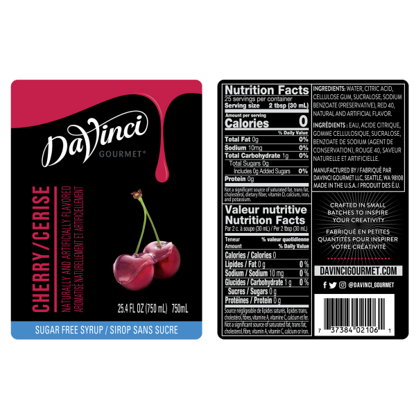 DaVinci Sugar-Free Cherry Syrup leaves a taste of summer, but without the hassle of pits, and sugar.Whether it's a cocktail, mocktail, flavored tea, or ice cream, DaVinci Sugar-Free Cherry Syrup is the perfect addition. Sweetened with Splenda, this treat is both calorie-free and sugar-free! You get the sweet and tart flavor of cherry without having to sacrifice your diet.