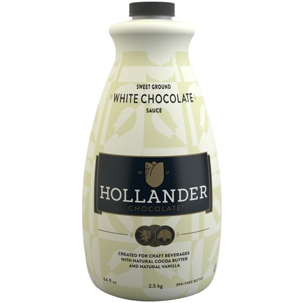 Hollander White Chocolate Café Sauce 64 oz is a large serving of natural clean label ingredients. This luscious white chocolate sauce can be used to concoct amazing coffeehouse-style beverages from lattes to frappes. This sauce tastes good, but it's also good on the environment because it uses Rainforest Alliance Certified Cocoa Butter. Made in the USA with American Cane Sugar and America Sea Salt. This white chocolate sauce is GMO Free, Soy Free, Gluten Free.