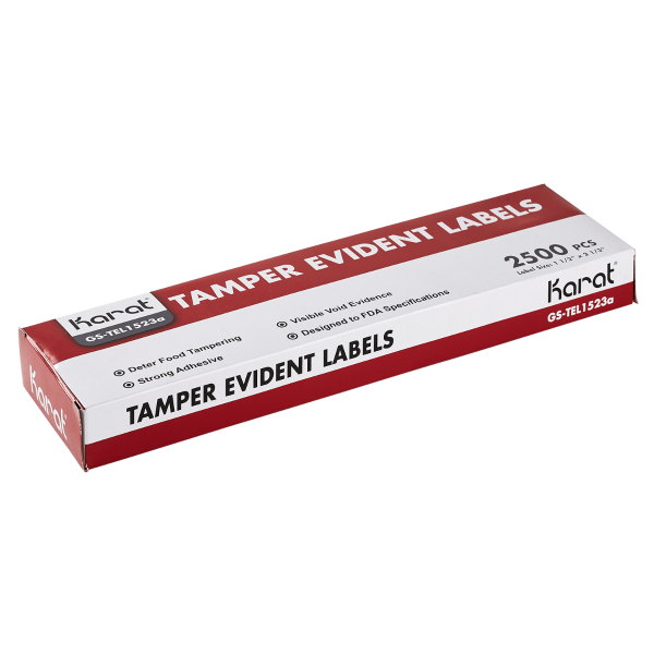 With takeout and food deliveries more prevalent, it is more important than ever to build trust for proper packaging. Give customers peace of mind by sealing food packaging with Karat Tamper Evident Labels. These labels will adhere securely and leave a void imprint upon removal to easily identify tampered packaging. The bold red tamper evident labels will deter food tampering so customers' food will be delivered safely and securely.